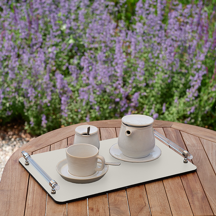 Нежный белый цвет в сочетании с панна котта придаёт подносу утончённый вид, а графитовая фурнитура добавляет современное звучание и насыщенность. Его универсальный стиль прекрасно впишется в любой интерьер - от классического до современного.