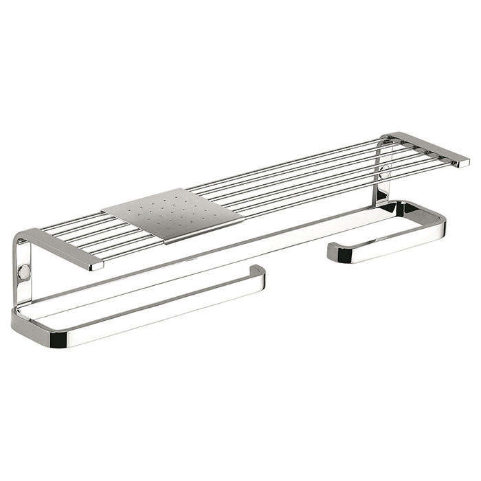 Полка оснащена удобным полотенцедержателем, который позволяет всегда иметь под рукой полотенца, а также держателем для туалетной бумаги, что делает её незаменимым аксессуаром для каждой ванной комнаты. Высококачественный хром не только придаёт эстетичный вид, но и обеспечивает защиту от коррозии, гарантируя долговечность и лёгкость в уходе.